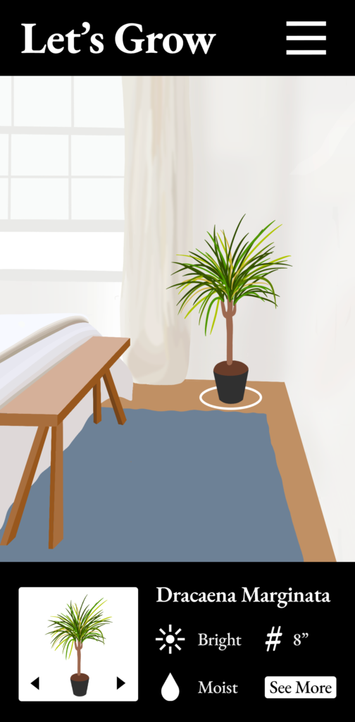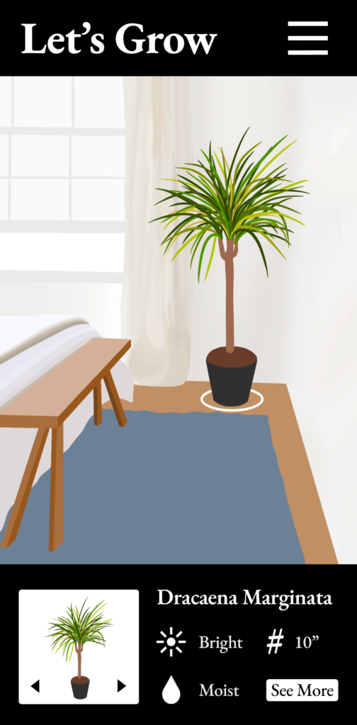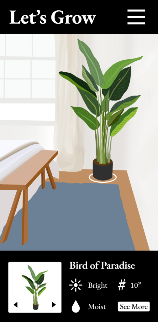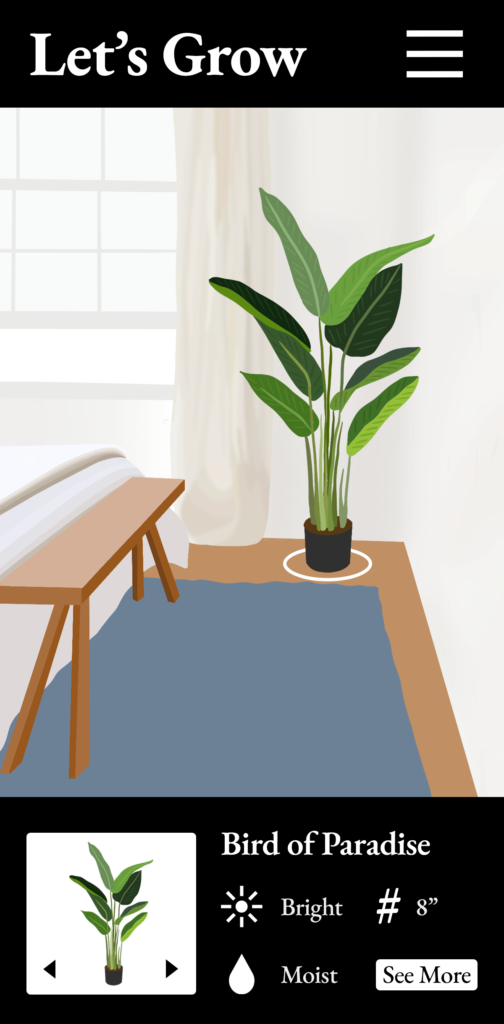 One thing that became really popular during quarantine was bringing the outdoors inside by purchasing houseplants. My augmented reality concept would involve an app that scans a room, measures the space, and locates the sources of light. The user would pick a space they are considering placing a plant. The app would then recommend plants that would thrive in that type of light and would show containers at different diameters to show how they would fill the space. This information would help users take the guess work out of buying house plants that might not work in the space. The app would be called “Let’s Grow”.